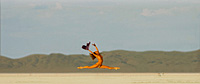 Burning Man girl walking along the giant letters reading “THING” in barren desert surreal setting.