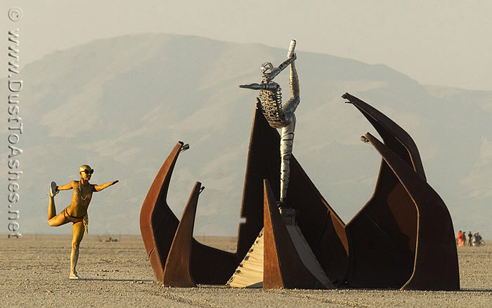 Gold body painted woman posing next to the sculpture of Silver Man.