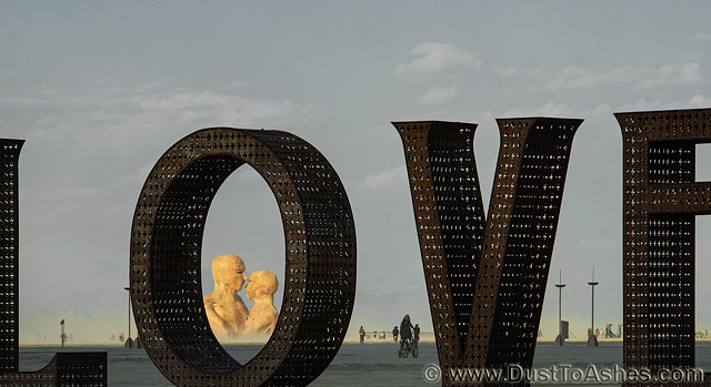 Perspective photo of LOVE and Embrace art installationLOVE embraced Embrace