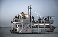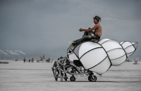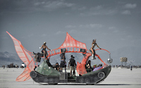 Tagged art car, blue vehicle, driving on playa, mushroom, mutant vehicle, party car, umbrella