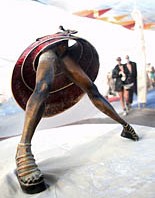 Detail view of bronze art installation looking at the Burning Man. Art by John Neary