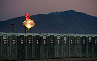 A twisted layers of metal forming a large scale double helix emerging from thick dust layers in front of Burning Man Center Camp.