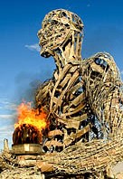 This is close up of one of the Crude Awakening figurative installations with spinning fireball. Crude Awakening metal art sculptures by Dan Das Mann Karen Cusolito Black Rock FX Mark Perez