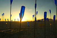 Powerful installation of blue bottles amplified by dramatic Black Rock City sunrise. Art sculpture created by Jan Delano.