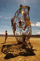 People climbing upon the welded bubble shaped abstract art object during the art festival in Nevada.