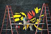 Tagged Baise-Moi, brick wall, mural, painter, painting girl