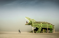 A breathtaking masterpiece called “Kaleidoscope Hole” by Michaela Hares, set against backdrop of the Burning Man statue. Three rings of the installation are aligned beneath the majestic expanse of three mountain horizons, creating a symphony of visual splendor.