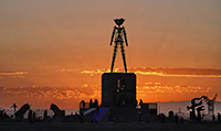 Neon silhouette of Burning Man during Nevada desert sunset.