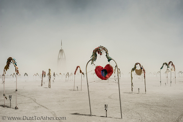 Black Rock City Cemetery in Dust Storm in front of the Flower Tower