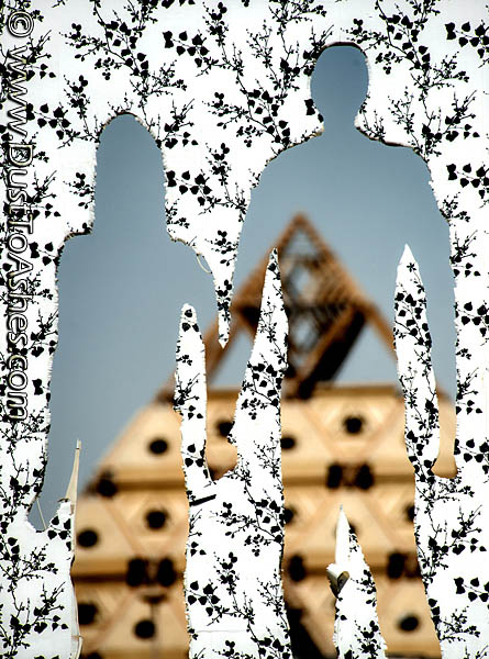 Anonymous silhouettes of man and woman walking towards the Temple of Whollyness.