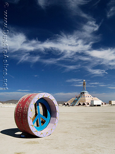 Mobile peace sign when rolled on playa leaves the imprints of quotes.