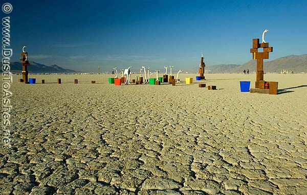 Burning Man Surreal image of barren vast desert and art installation of metal cubes and reaching hands.