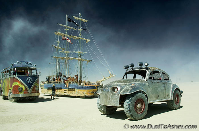 Super sized (1 : 1.5) Volkswagen bug and bus built on fire engine frames.