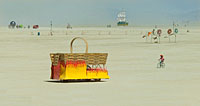 Tagged art car, boat in desert, burning man, mutant vehicle, yacht in desert