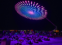 Tagged 2022, art installation, art sculpture, Burning Man 2022, Christopher Schardt, cosmic disk, LED light, light effect, music show, night, Paraluna, people, suspended art, UFO sclulpture