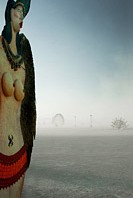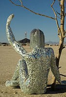 Mirror mosaic sculpture of woman sitting next to the tree greeting the Burning Man.