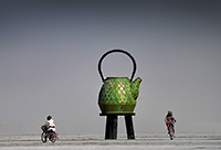 A breathtaking masterpiece called “Kaleidoscope Hole” by Michaela Hares, set against backdrop of the Burning Man statue. Three rings of the installation are aligned beneath the majestic expanse of three mountain horizons, creating a symphony of visual splendor.