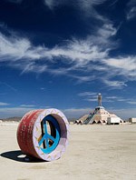 Mobile peace sign when rolled on playa leaves the imprints of quotes.